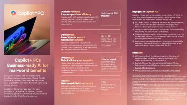 Turn everyday devices into AI-ready business tools. This solution brief highlights how these PCs combine powerful performance, built-in security, and AI features to improve productivity and efficiency. See how Copilot+ PCs support faster workflows, stronger protection, and all-day performance by reading the brief.